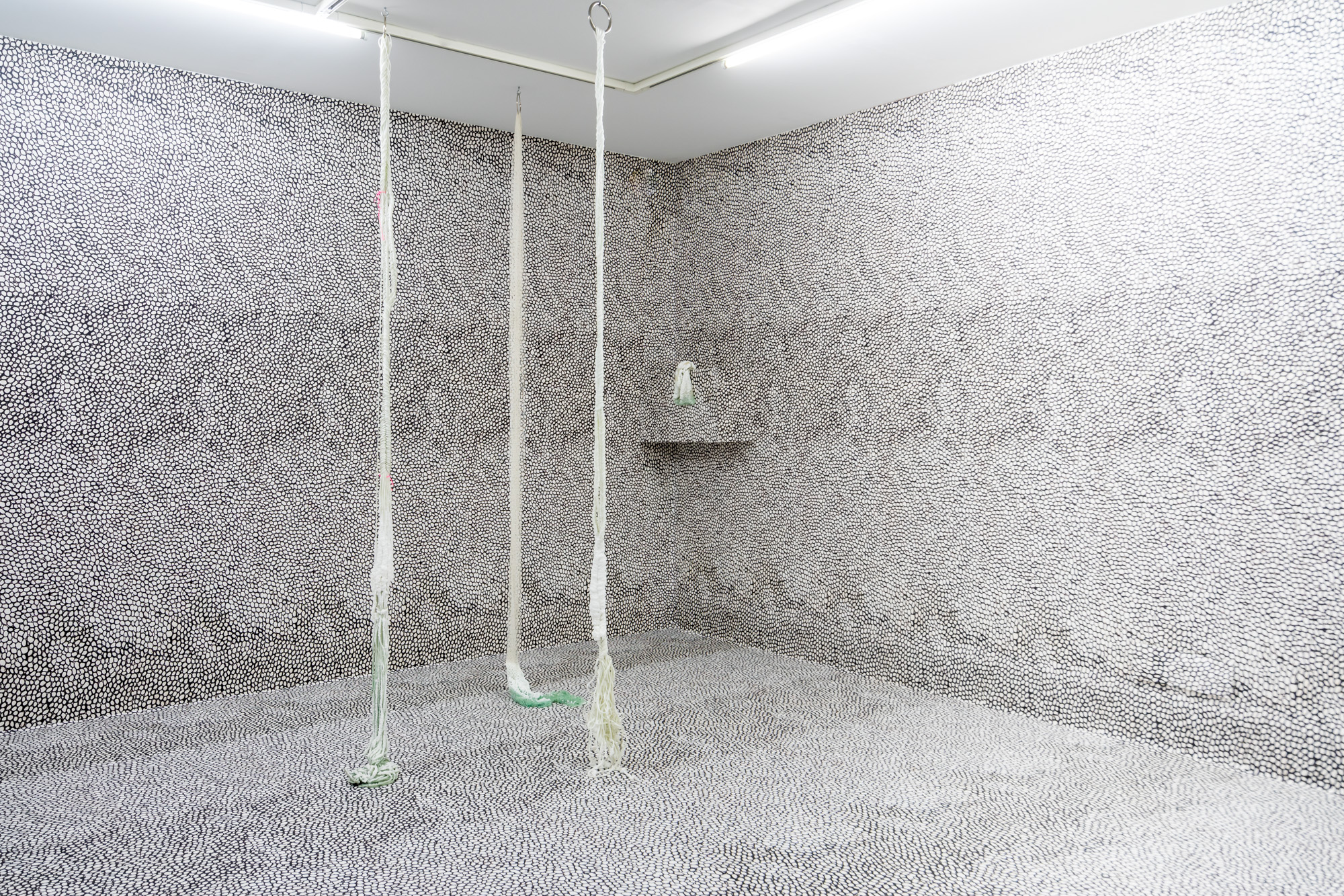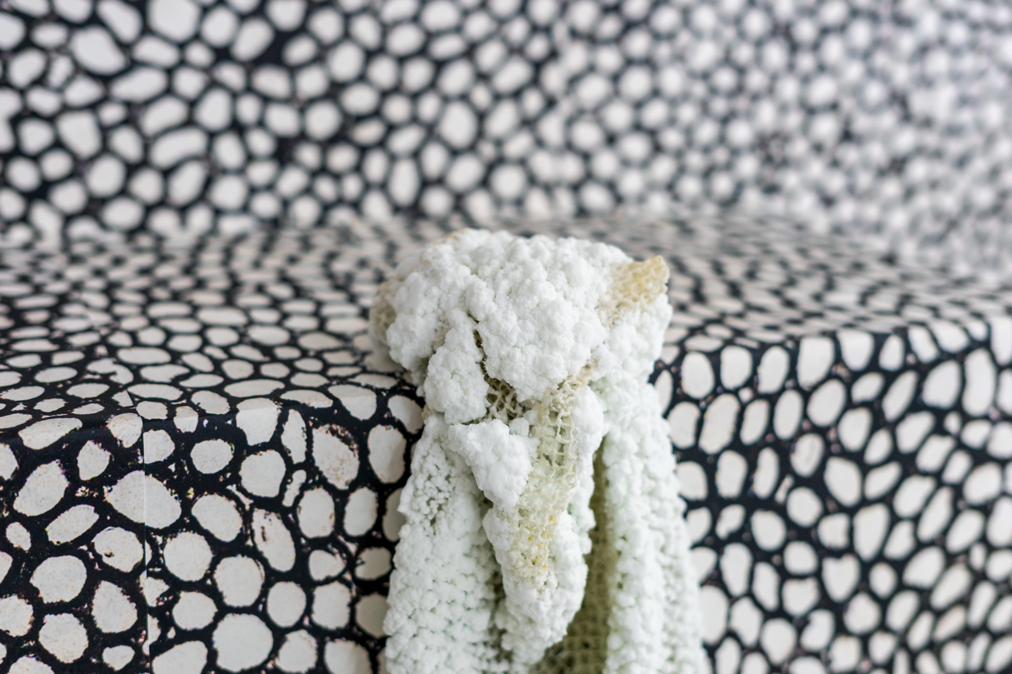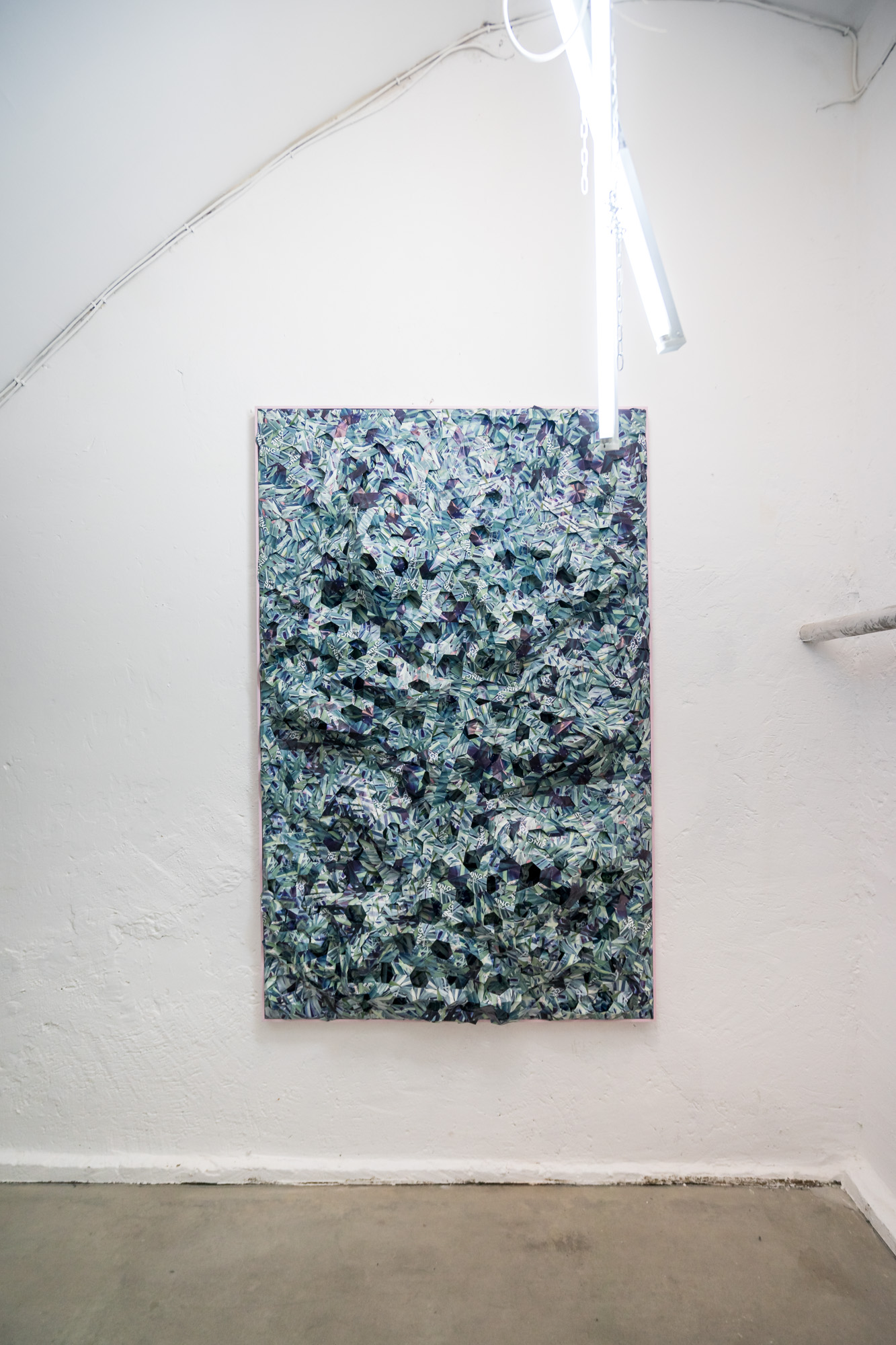 Die Titelgebende Rauminstallation „Smells like Apohenia“ untersucht im Zusammenspiel von großformatigem Digitaldruck, Zeichnung und Skulptur Abweichungen von künstlichem- und natürlichem Wachstum und spielt mit der menschlichen Tendenz optische Wahrnehmung mit Informationen und Bedeutungen zu belegen.