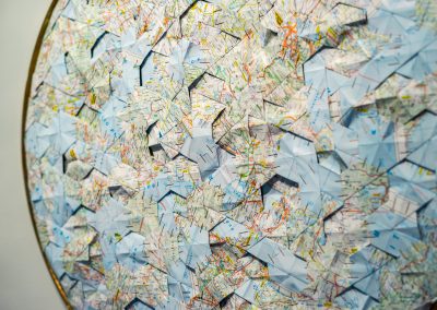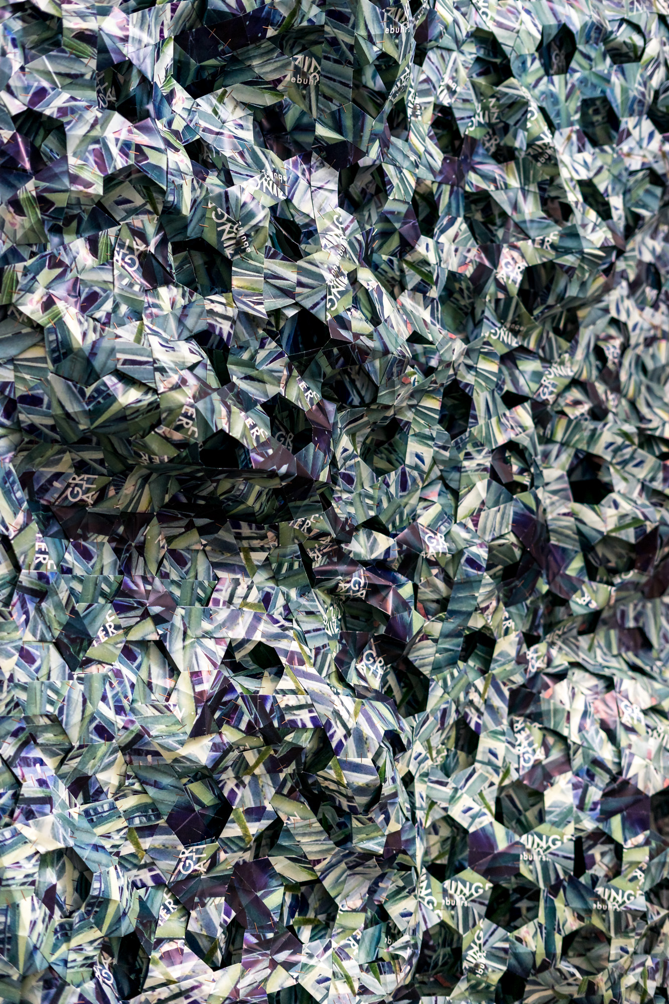 Die Installation folgt klaren Strukturen, inhärenten Doppelungen und Regelmäßigkeiten. Tausende von kleinen Kopien bilden insgesamt eine homogene Oberfläche, deren Haptik durch Fragmentierung und Widerspiegelungen der jeweils einzelnen Kopien verstärkt wird.