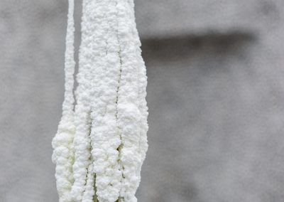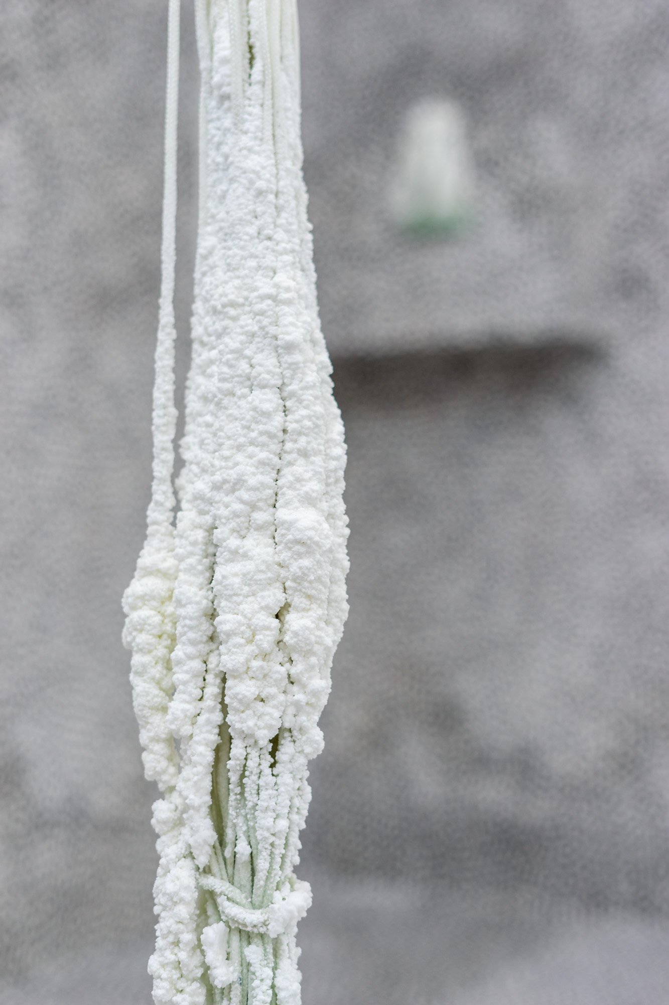 Im Gegensatz zu dieser Künstlichkeit stehen aus Tauen geflochtene Stränge an denen Salzkristalle emporwachsen. Es sind scheinbar chaotische und vielleicht sogar ‚ungewollte’ Strukturen, deren Verlauf nicht von Menschenhand-, als mehr durch die Natur und ihren Temperatur- und Zeitverläufen geprägt sind.